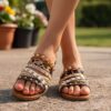 Trendy Style Women’s Slippers – Brown Multi Strap Flat Sandals With Studs & Stones | Comfortable Daily Wear Slides.